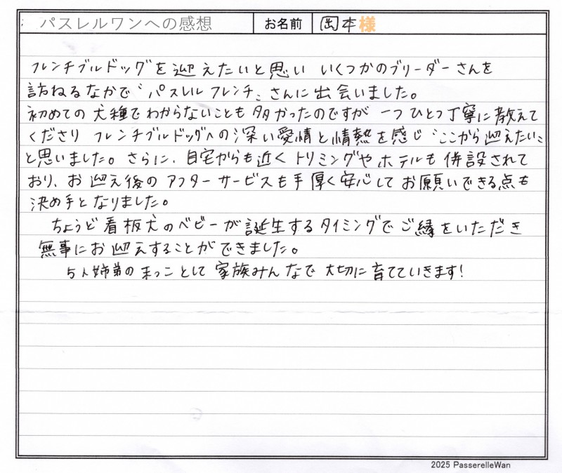 ご丁寧な説明のおかげでパピー期の子を飼育するのは初めてでしたが不安なく育てる事ができています。